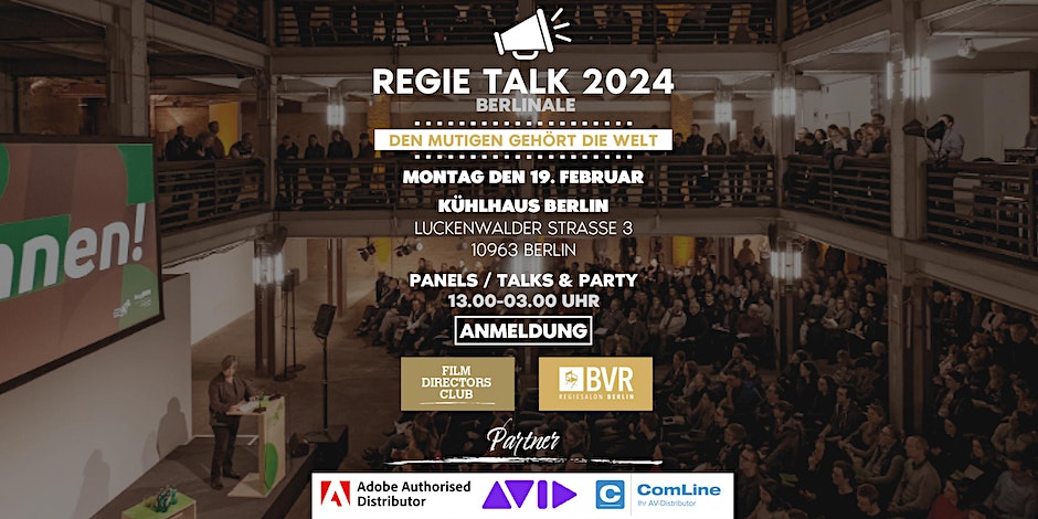 Einladung zum Regie Talk 2024 – Den Mutigen gehört die Welt | Montag, den 19.02.2024 – Kühlhaus Berlin, Luckenwalder Strasse 3 10963 Berlin Der „REGIE TALK 2024“, wird dieses Jahr gemeinsam vom Film Directors Club und dem BVR-Regiesalon / Regieverband ausgetragen – in Kooperation mit dem Filmschlossfest und I SEE YOU. Der REGIE TALK also mal ganz anders:…